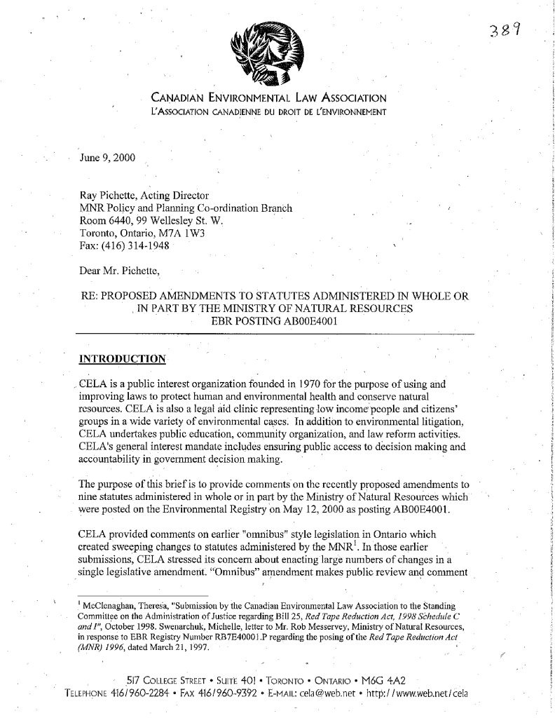 Comments re: proposed amendments to statutes administered in whole or in part by MNR – EBR posting AB00E4001