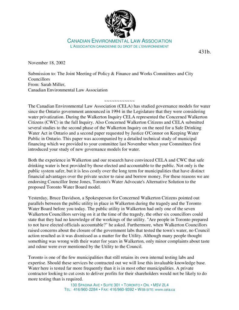 Comments Regarding Governance Models for Water to Joint Meeting of Toronto Policy and Finance and Works Committees and City Councillors in Toronto