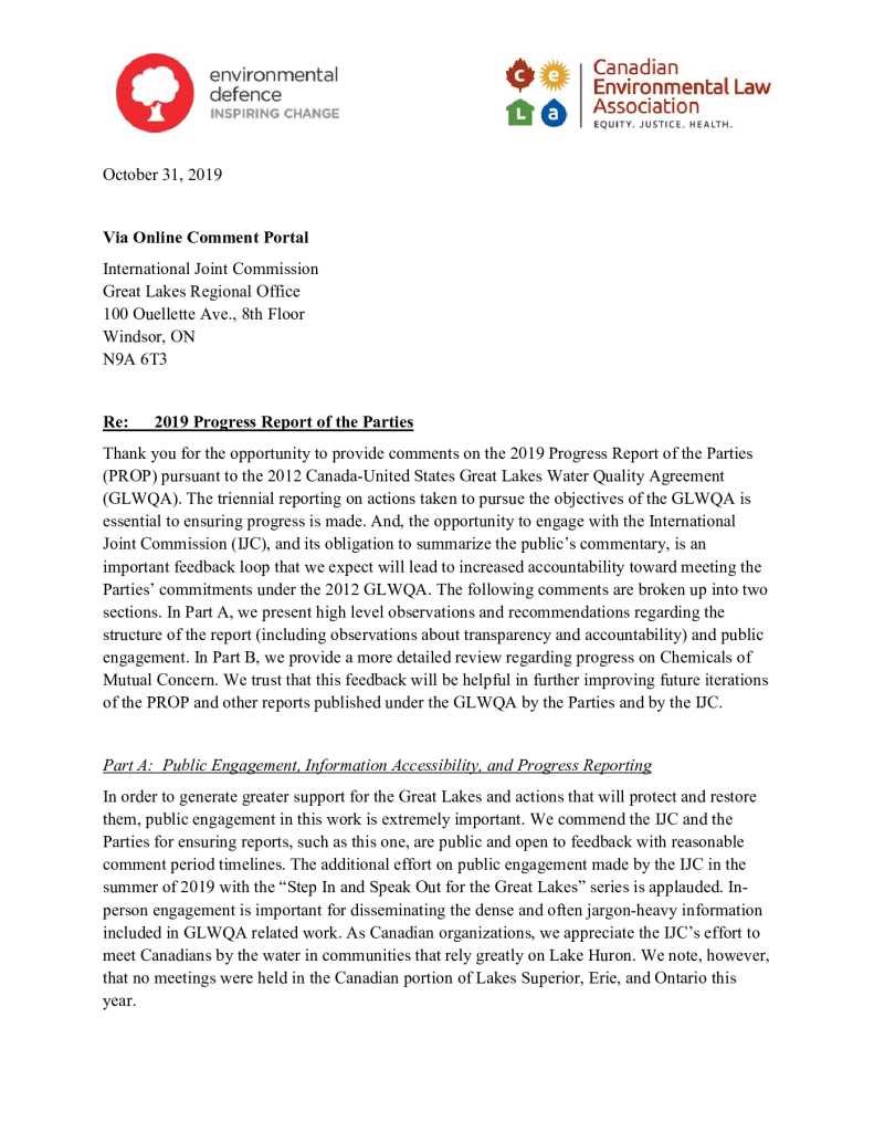 Comments to International Joint Commission Regarding 2019 Progress Report of the Parties
