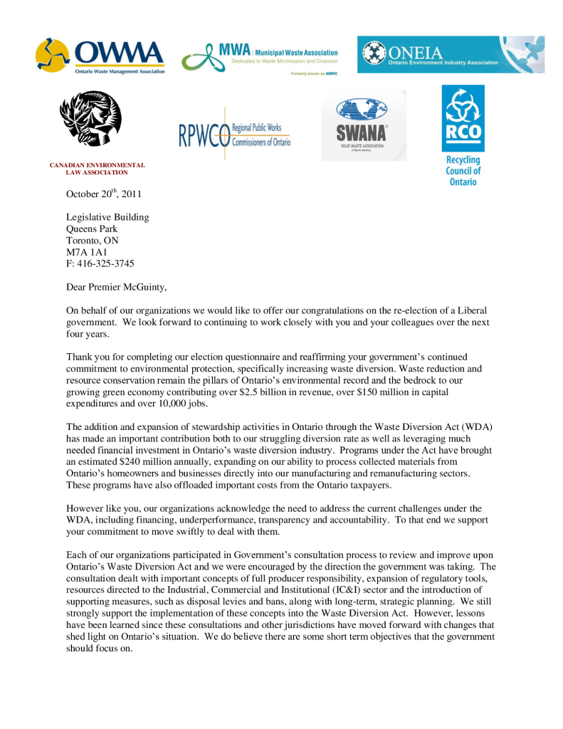 Comments to Premier Dalton McGuinty regarding the Waste Diversion Act