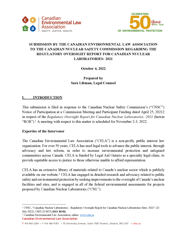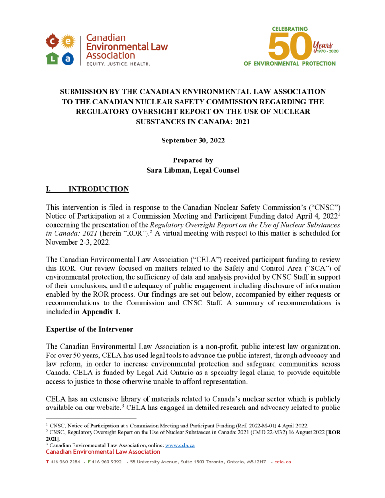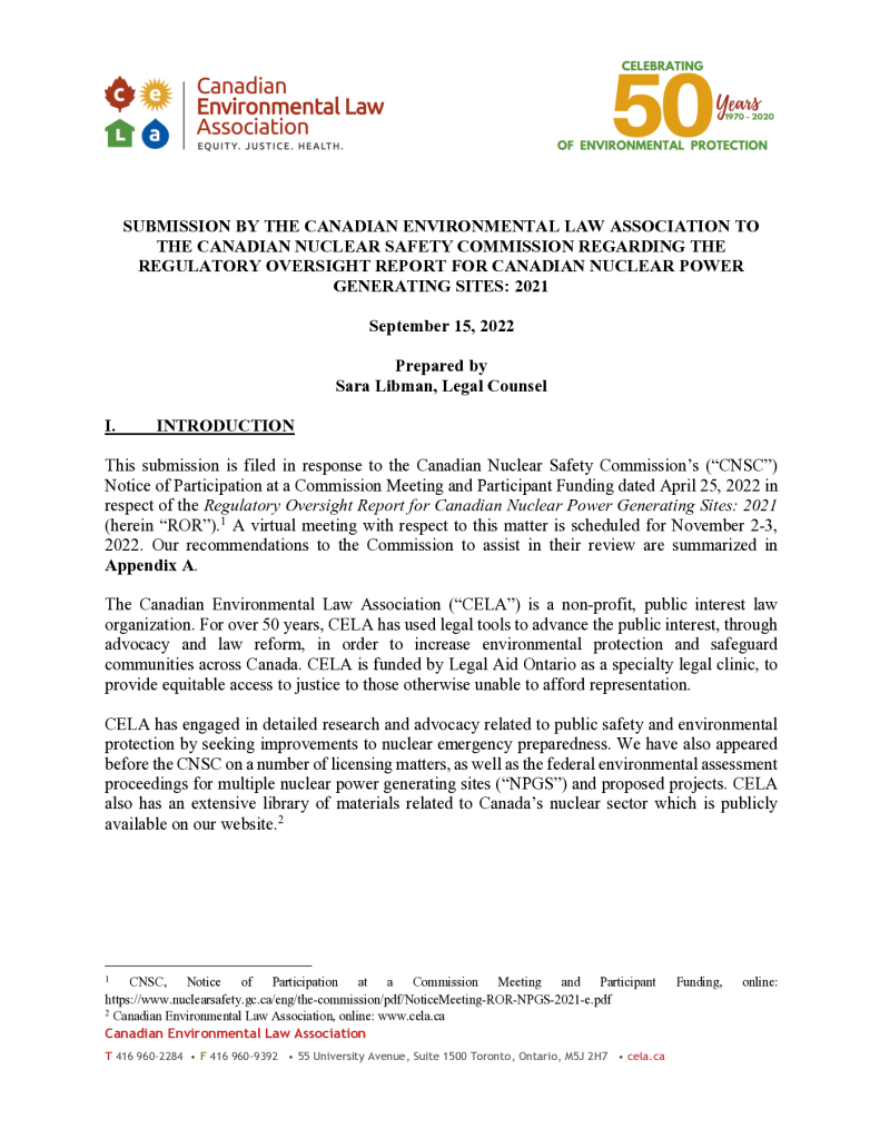 Comments to the Canadian Nuclear Safety Commission on a Series of Regulatory Oversight Reports (2021)