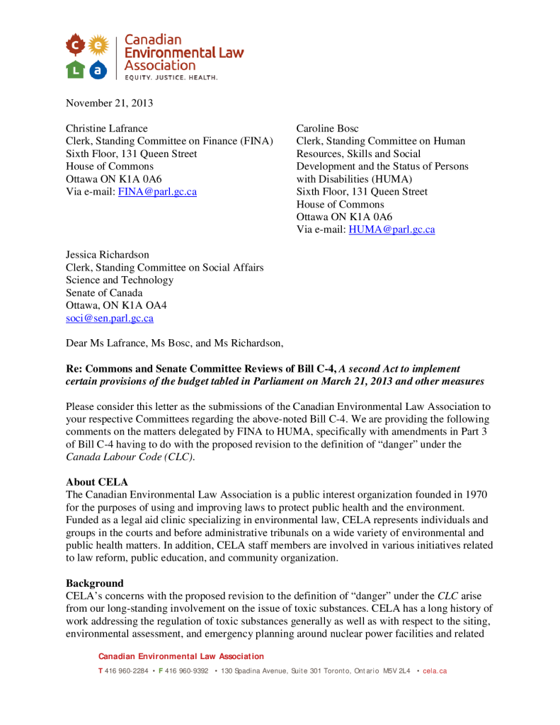 Commons and Senate Committee Reviews of Bill C-4, A second Act to implement certain provisions of the budget tabled in Parliament on March 21, 2013 and other measures Revision to the definition of “danger” in the Canada Labour Code