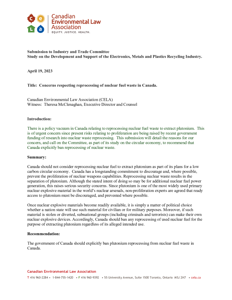 Concerns Respecting Reprocessing of Nuclear Fuel Waste in Canada
