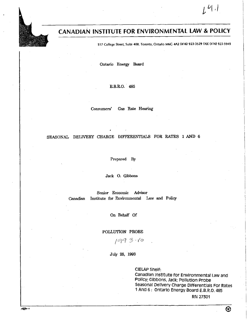 Consumers’ gas rate hearing: Seasonal delivery charge differentials for rates 1 and 6