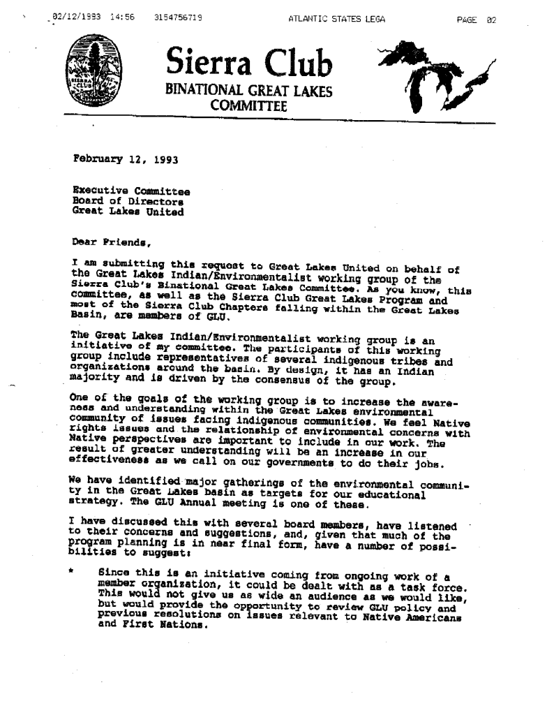 Correspondence to Great Lakes United on environmental community issues facing indigenous peoples