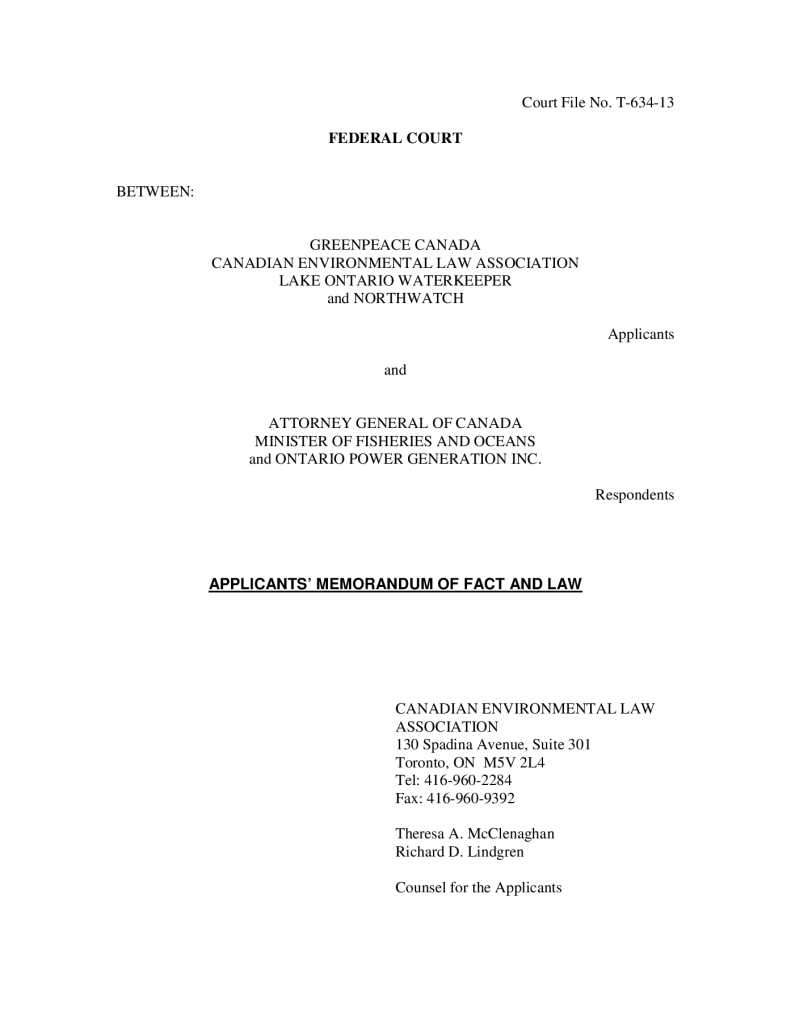 Darlington Refurbishment Factum Applicants Memorandum of Fact and Law filed with the Federal Court.