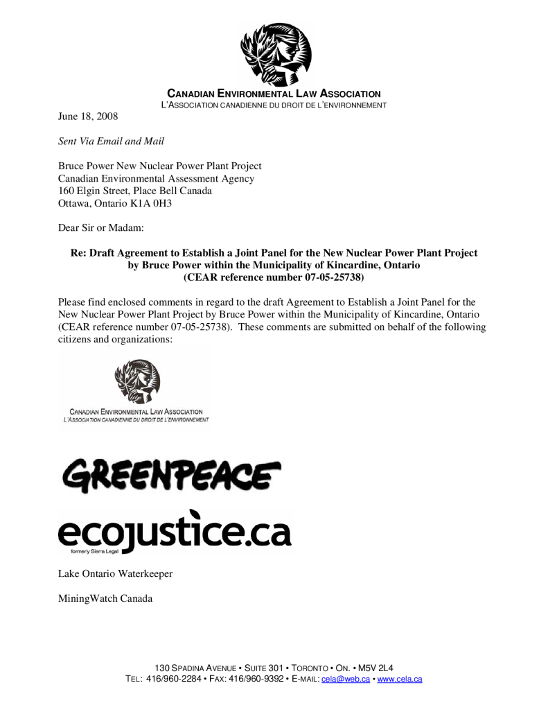 Draft agreement to establish a Joint Panel for the New Nuclear Power Plant Project by Bruce Power within the municipality of Kincardine, Ontario