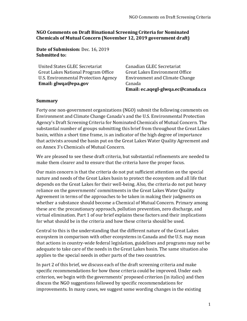 Draft Binational Screening Criteria for Nominated Chemicals of Mutual Concern under the GLWQA