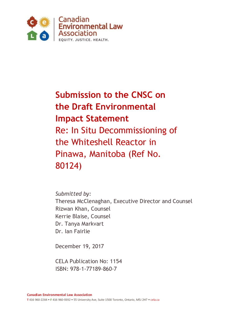 Draft Environmental Impact Statement Re: In Situ Decommissioning of the Whiteshell Reactor in Pinawa, Manitoba (Ref No. 80124)