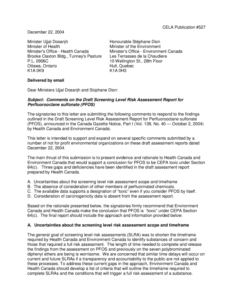 Draft Screening Level Risk Assessment Report for Perfluorooctane sulfonate