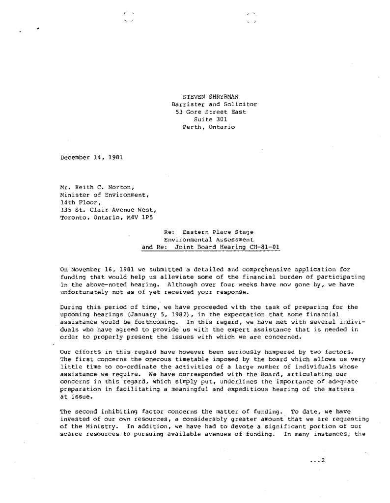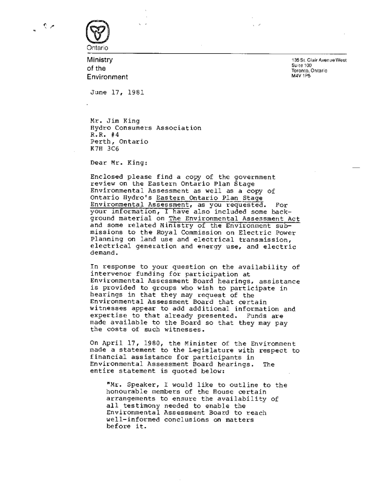 Eastern Ontario plan stage environmental assessment – correspondence