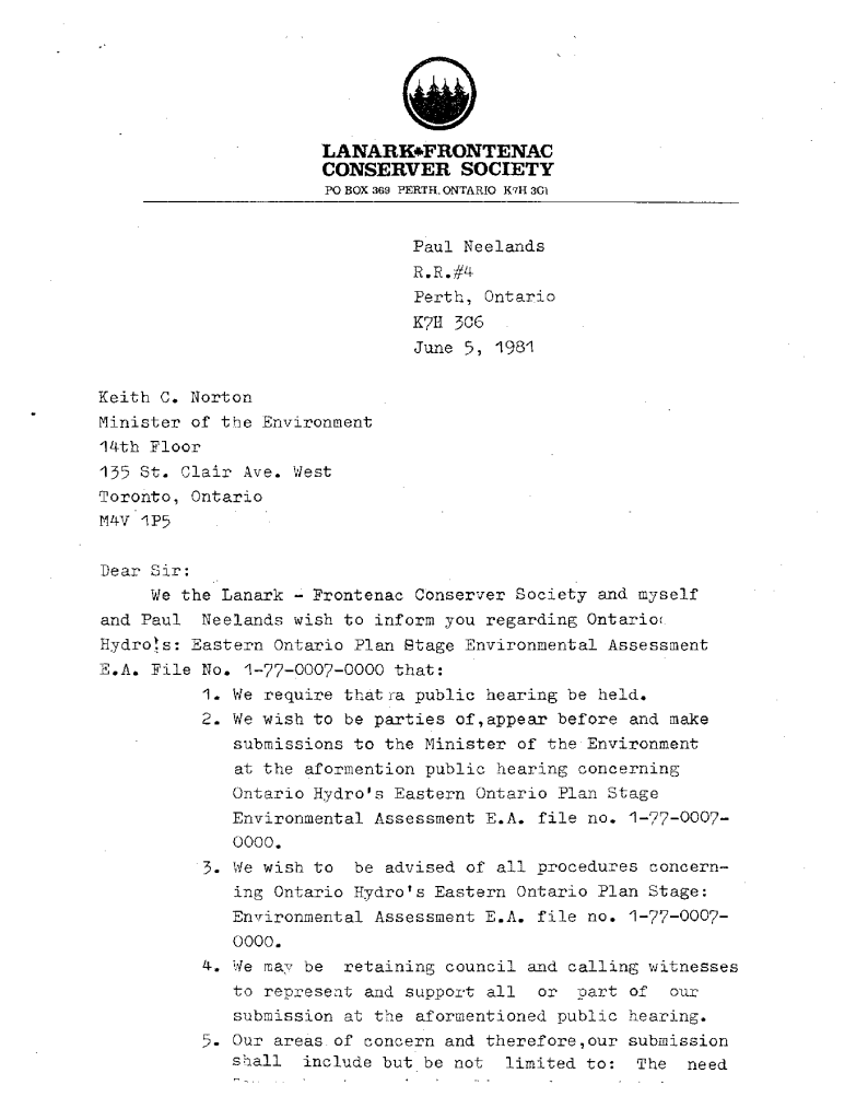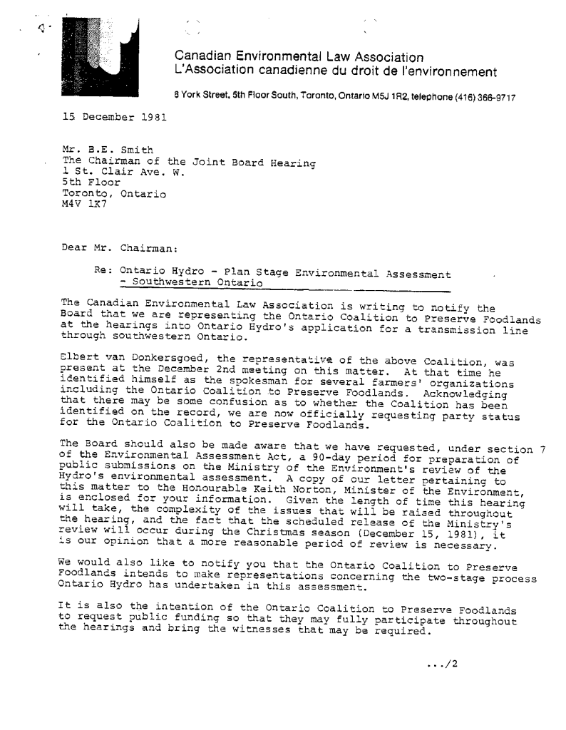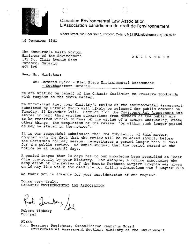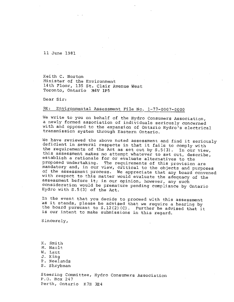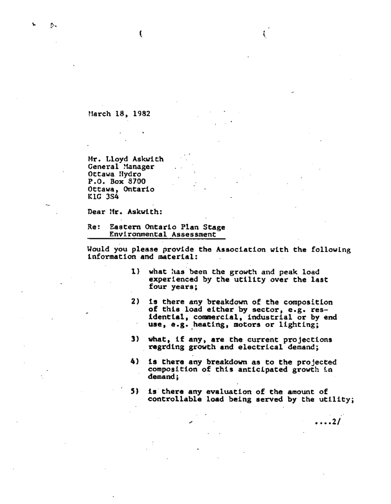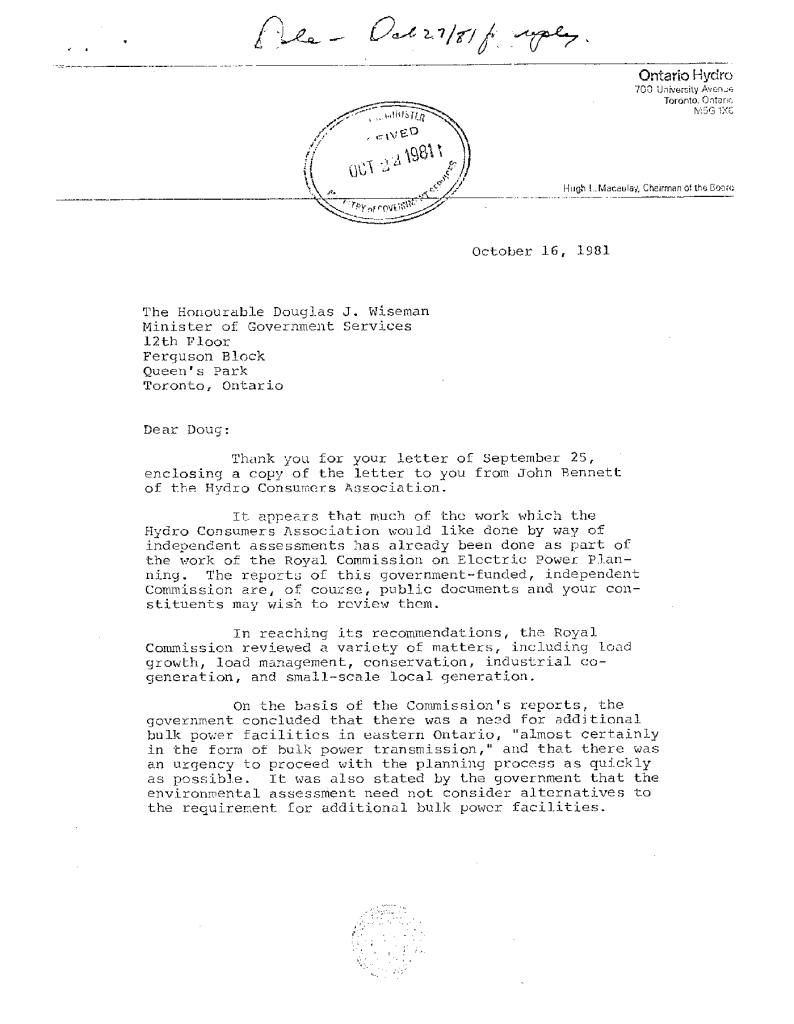 Correspondence concerning expansion of Ontario Hydro transmission line expanstion