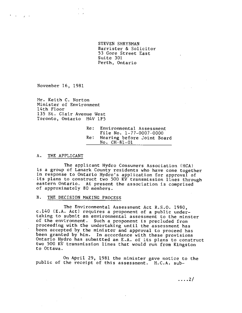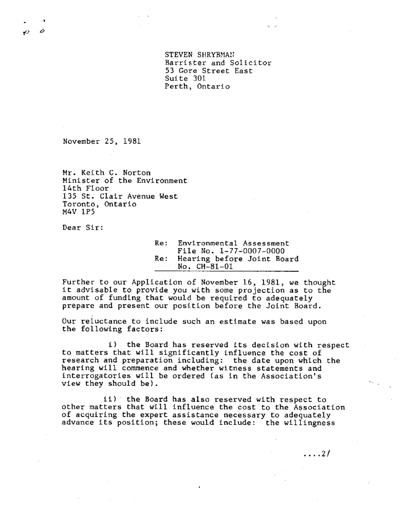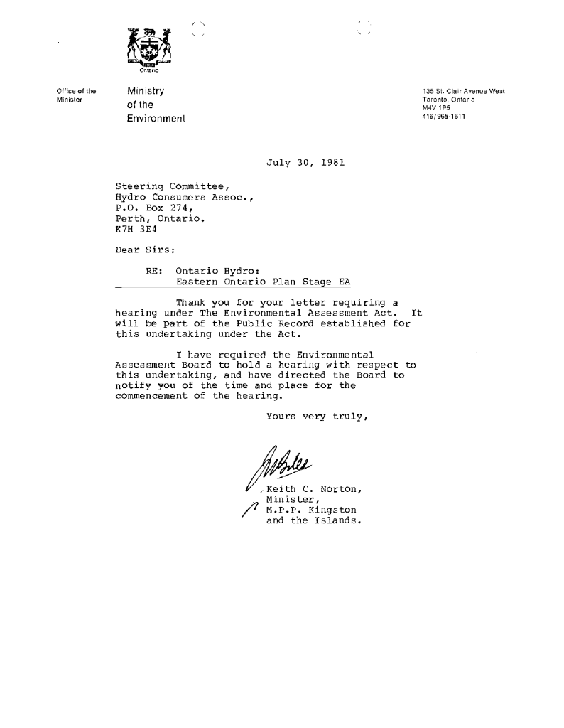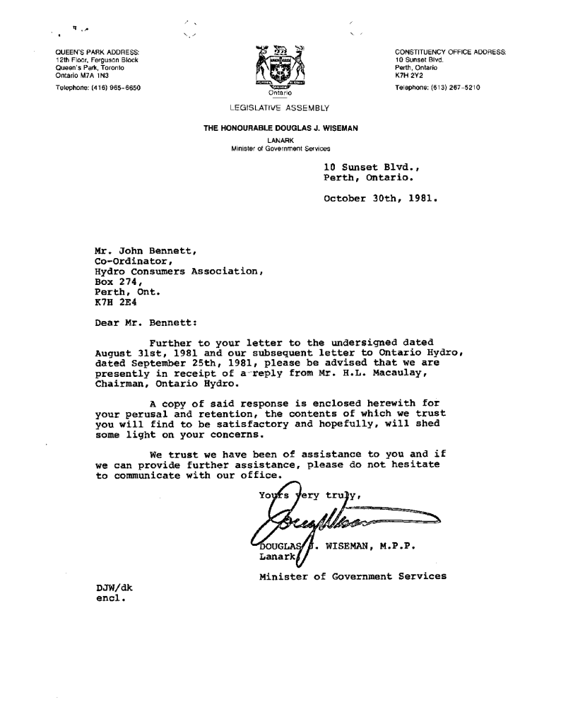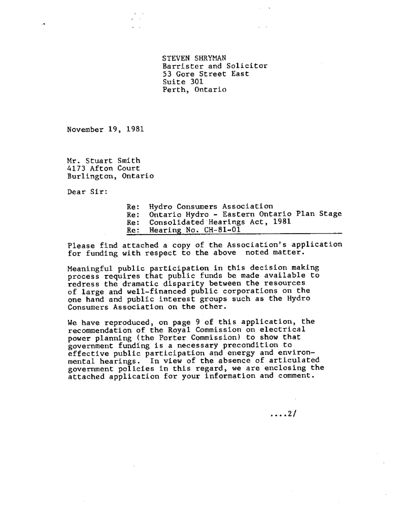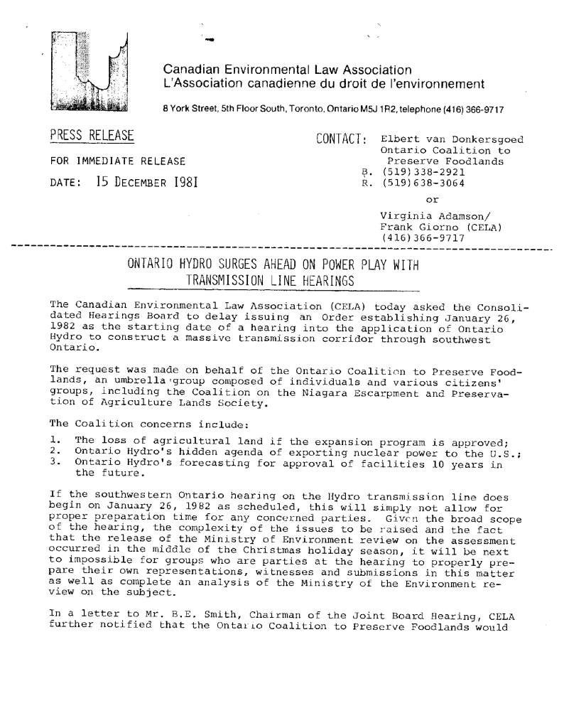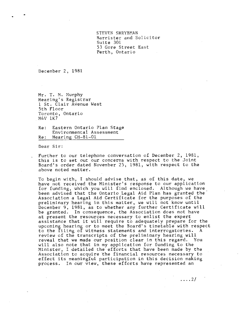 Correspondence concerning expansion of Ontario Hydro transmission line expanstion