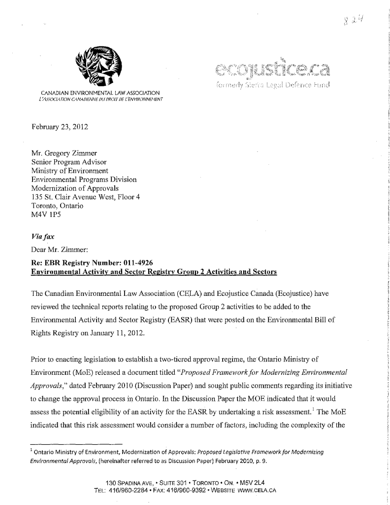 EBR Registry No. 011-4926 Environmental Activity & Sector Registry Group 2 Activities and Sectors