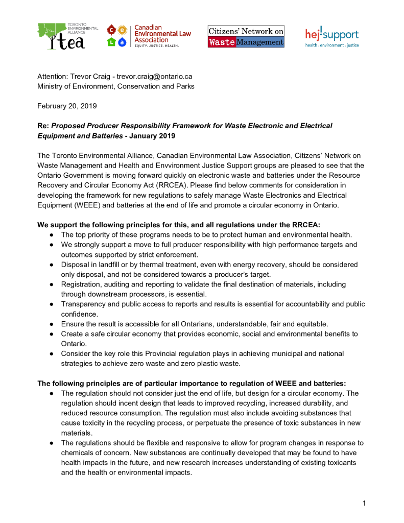 ENGO Comments on Framework for Waste Electronic and Electrical Equipment and Batteries