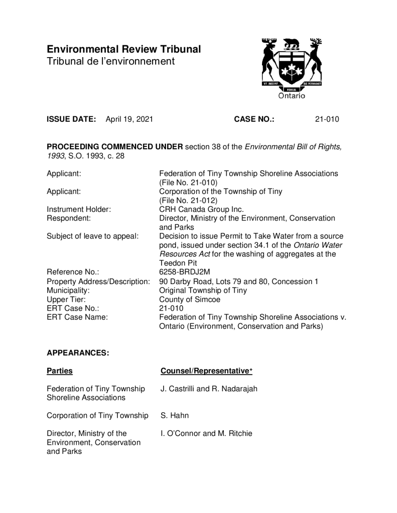 ERT Decision – Federation of Tiny Township Shoreline Associations vs. MECP re Permit to Take Water