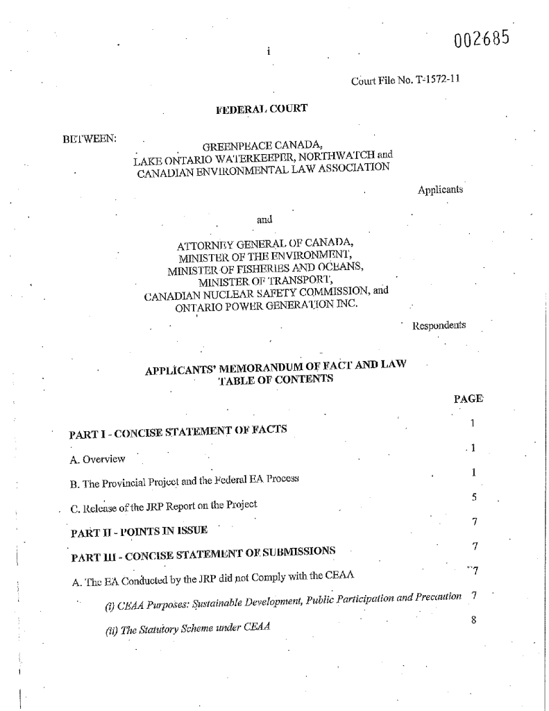 Factum, Darlington New Build Judicial Review Memorandum of Fact and Law submitted to the Federal Court of Canada