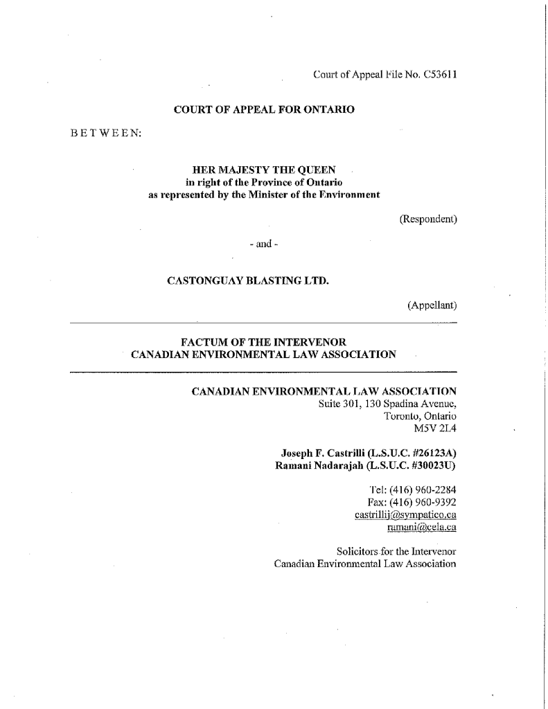 Factum of the Intervener, Ontario Court of Appeal, R v Castonguay Blasting Ltd.