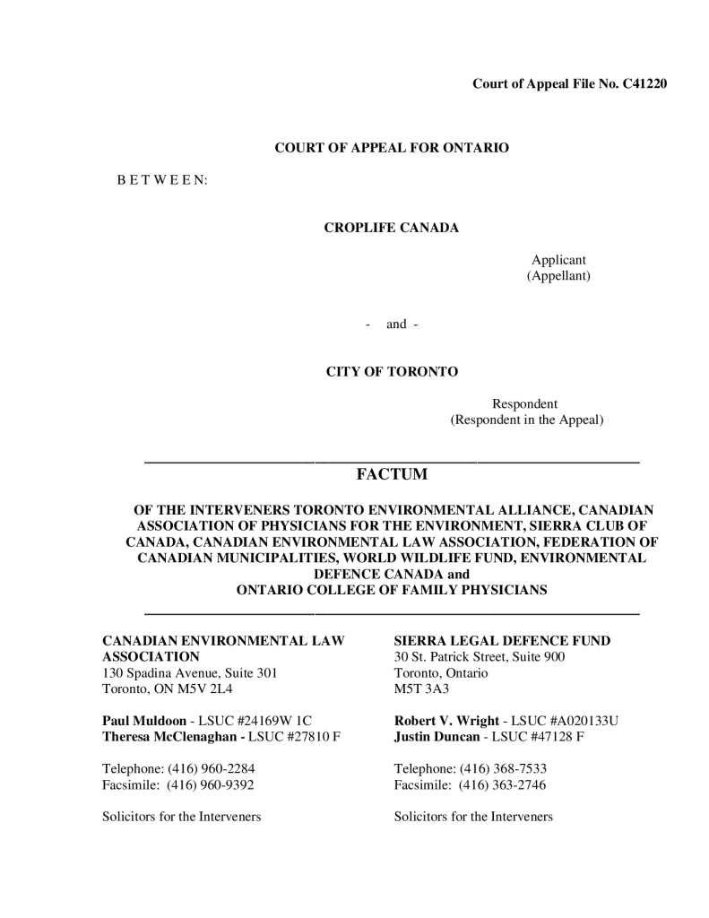 Factum of the interveners, Ontario Court of Appeal – Toronto Pesticide Bylaw