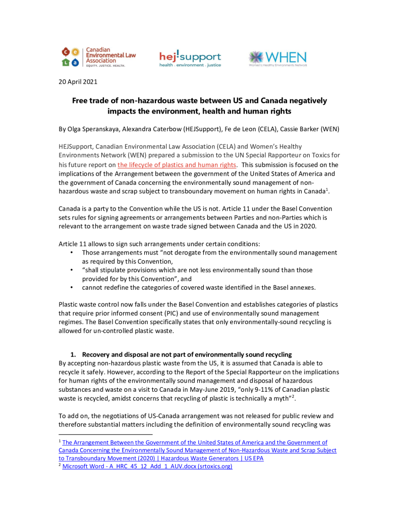 Free trade of non-hazardous waste between US and Canada negatively impacts the environment, health and human rights