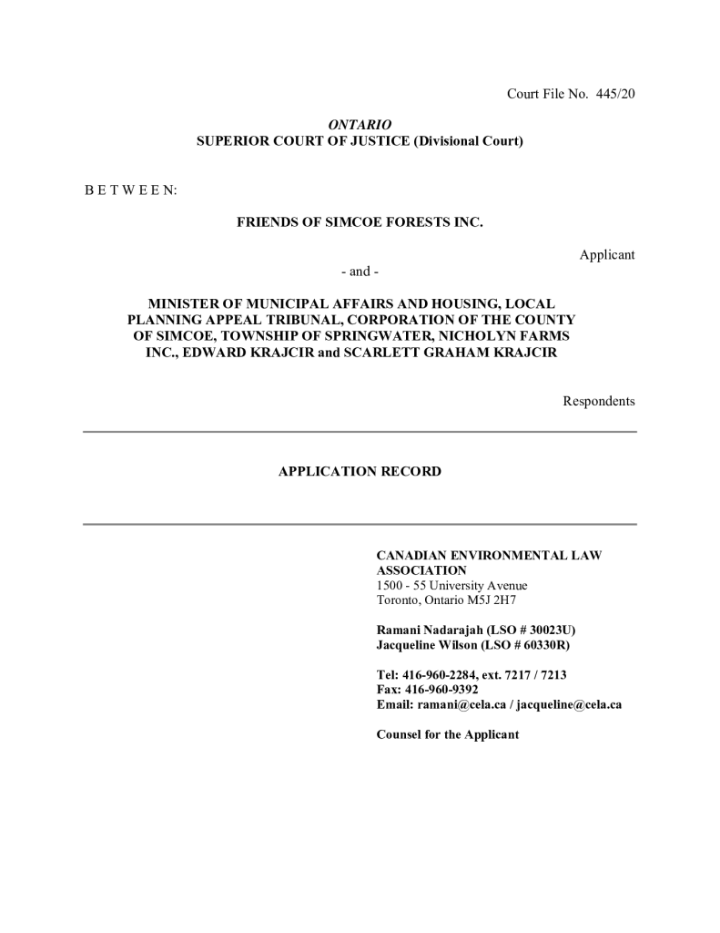 Friends of Simcoe Forest Application Record filed in Divisional Court
