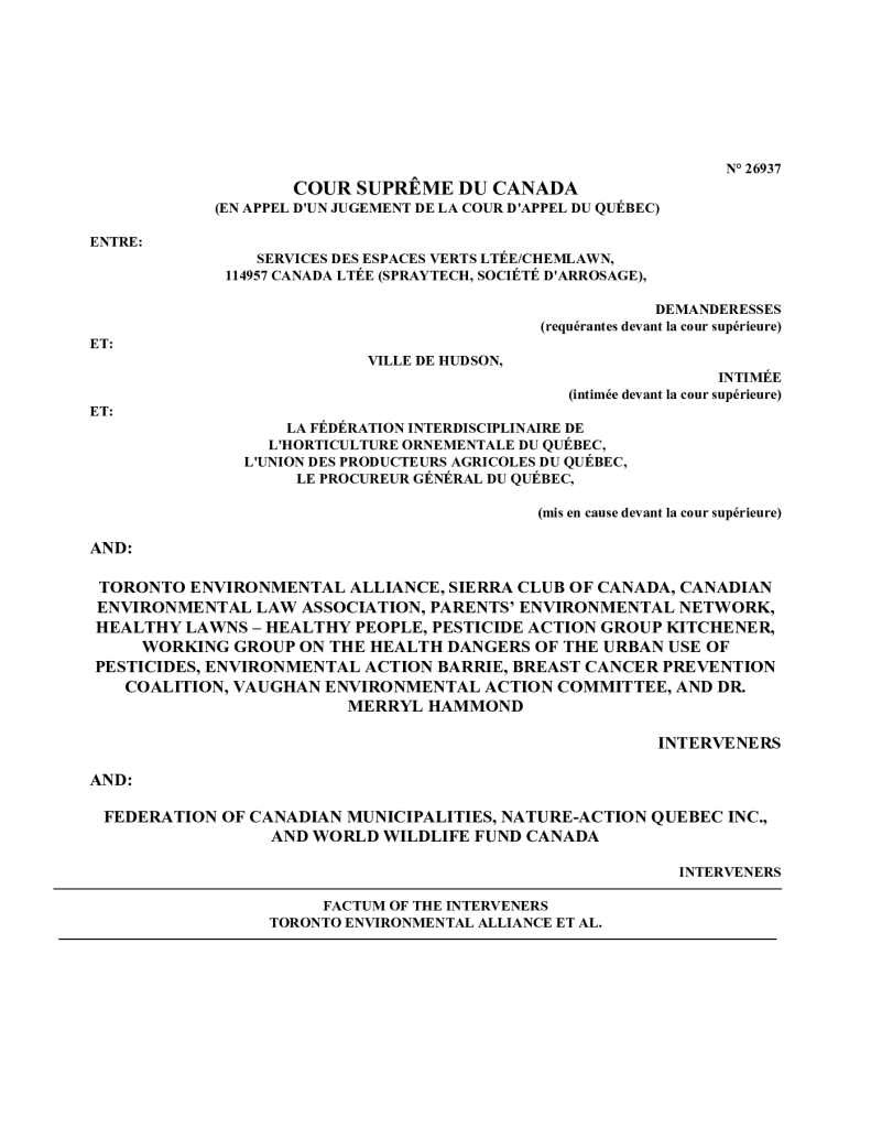 Full Text of Intervenors’ Factum of Law to the Supreme Court of Canada Regarding the Hudson, Quebec Pesticide By-law