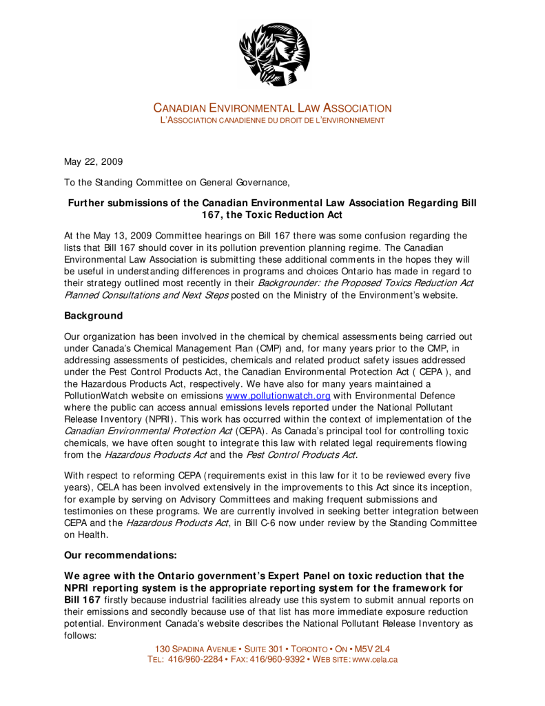 Further submissions on Bill 167, the Toxic Reduction Act