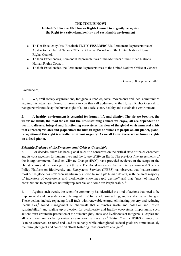 Global Call for the UN Human Rights Council to urgently recognise the Right to a safe, clean, healthy and sustainable environment