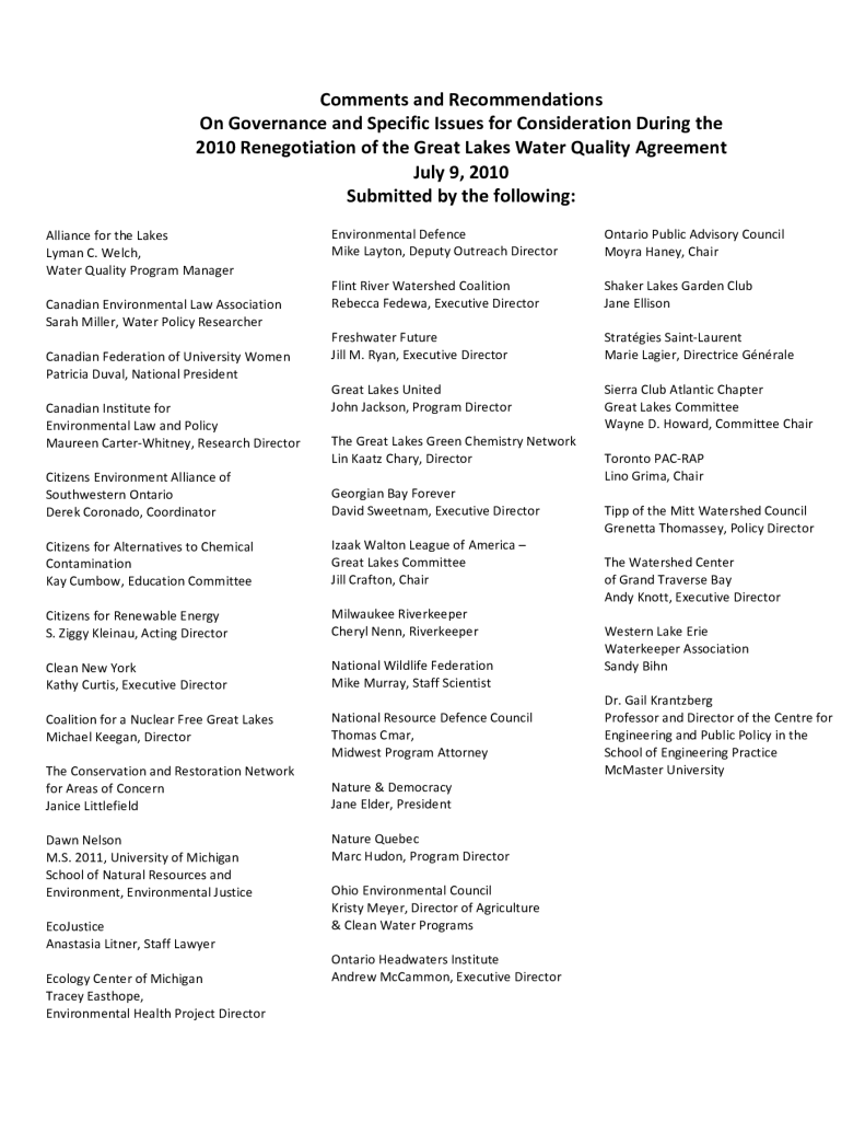 Governance and Specific Issues for Consideration During the 2010 Renegotiation of the Great Lakes Water Quality Agreement