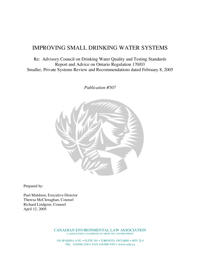 Improving small drinking water systems. Re: advisory council on drinking water quality and testing standards report and advice on Ontario regulation 170/03 smaller, private systems review and recommendations dated February 8, 2005