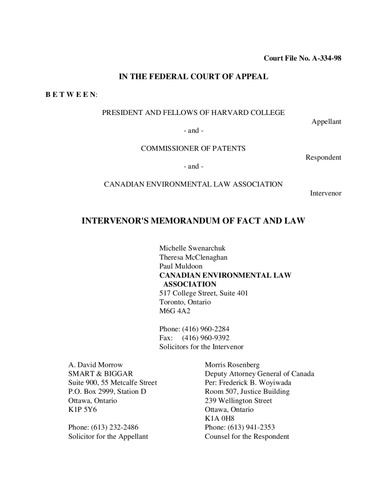 Intervener’s Memorandum of Fact and Law, Fellows of Harvard College v. Comissioner of Patents