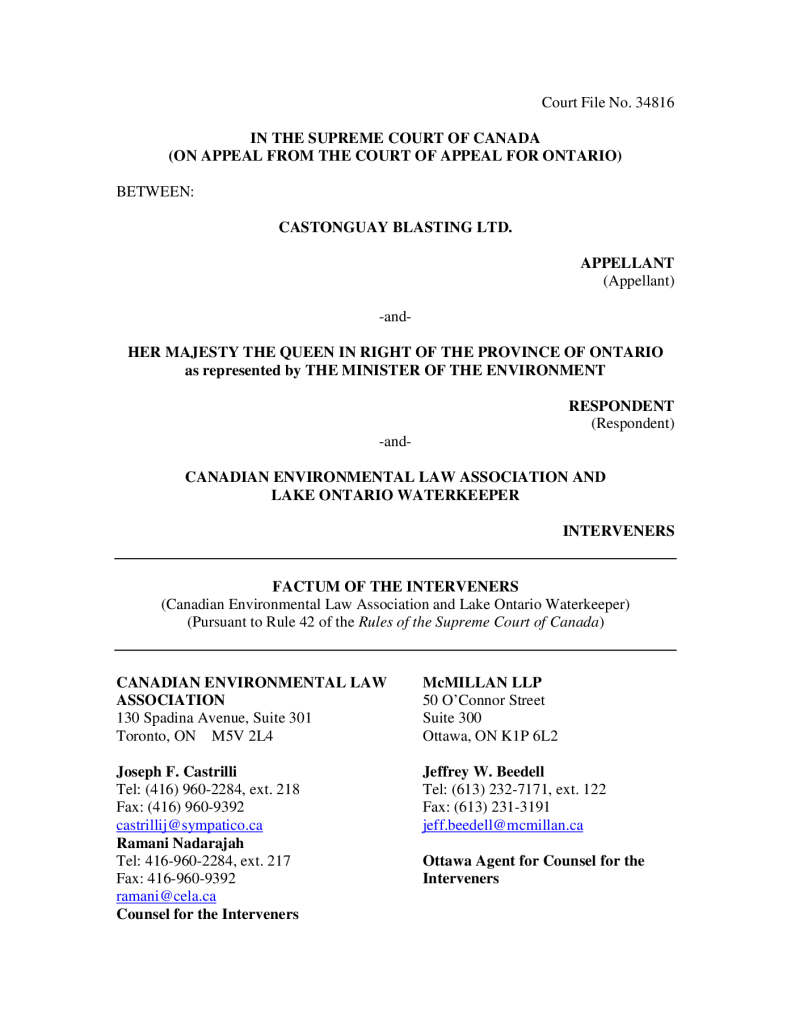 Intervenor’s Factum of Law to the Supreme Court of Canada – Castonguay Blasting