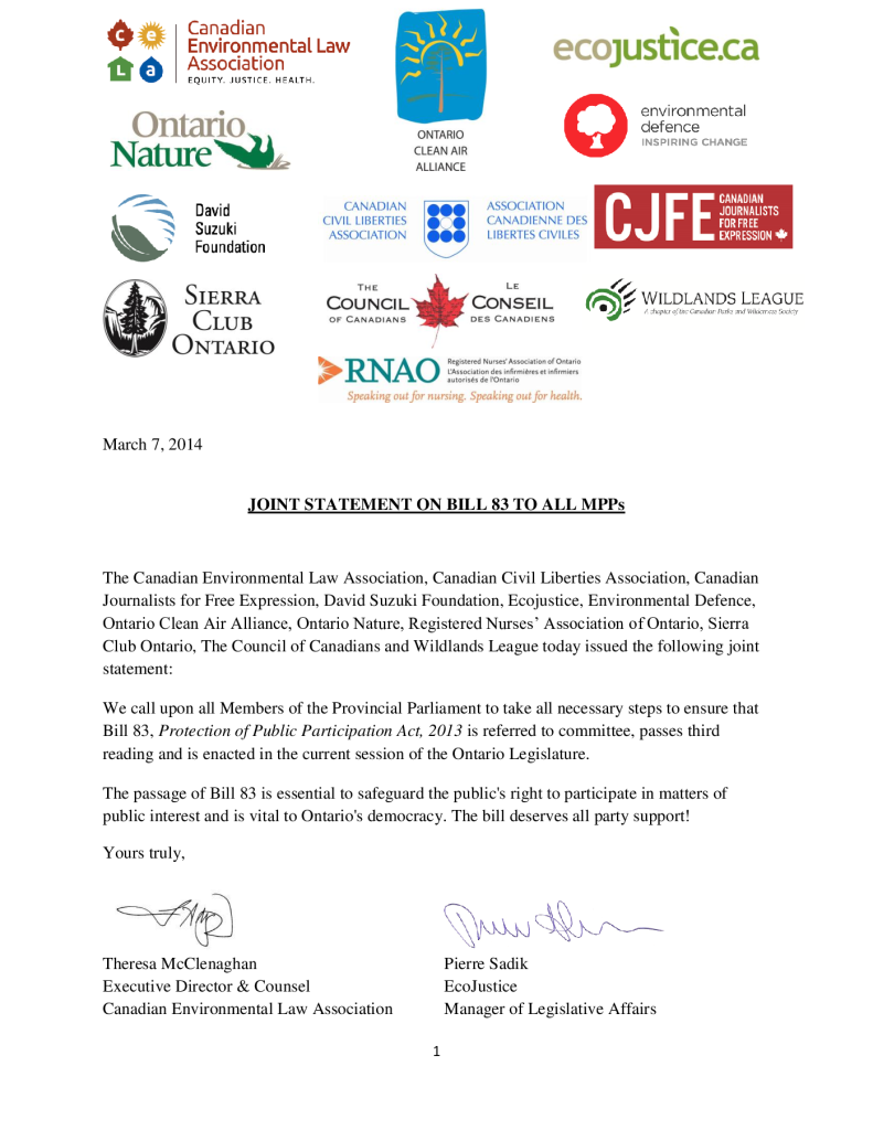 Joint Statement On Bill 83 TO All MPPs Joint Statement on Bill 83, Protection of Public Participation Act, 2013