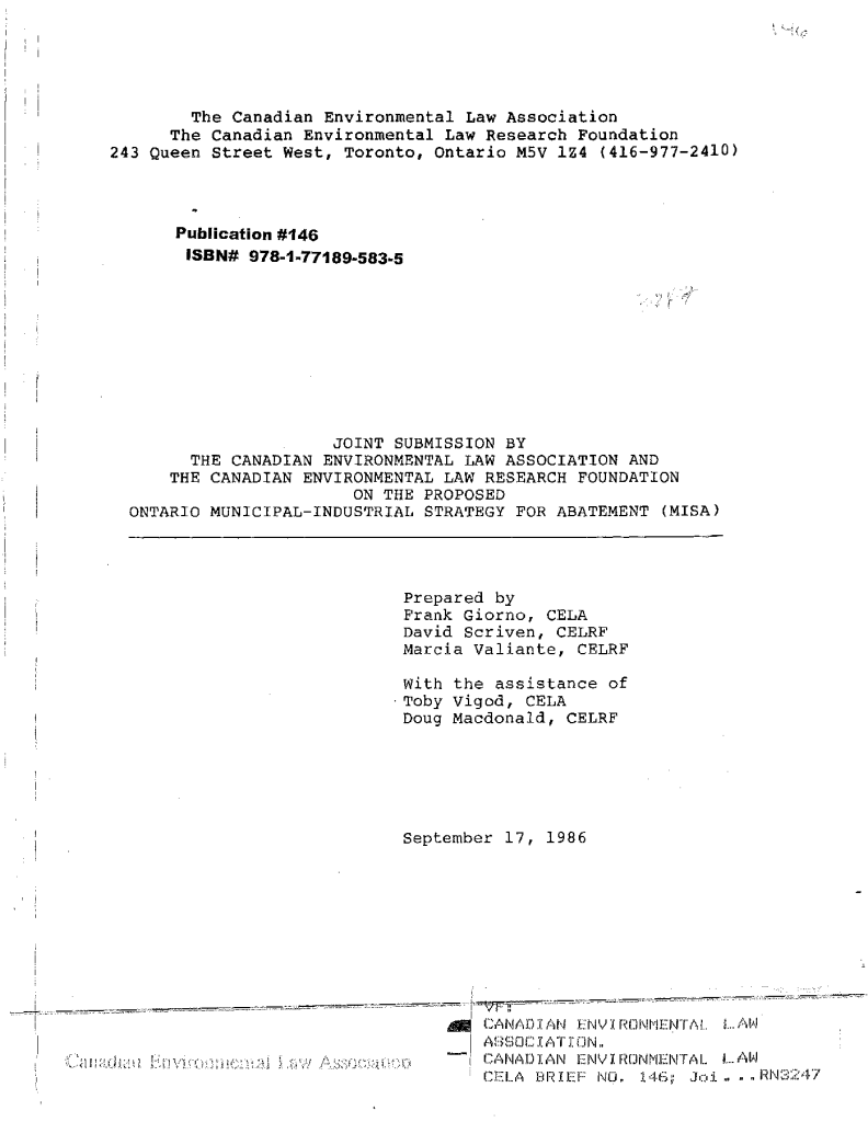 Joint submission by the Canadian Environmental Law Association and the Canadian Environmental Law Research Foundations on the proposed Ontario municipal-industrial strategy for abatement (MISA)