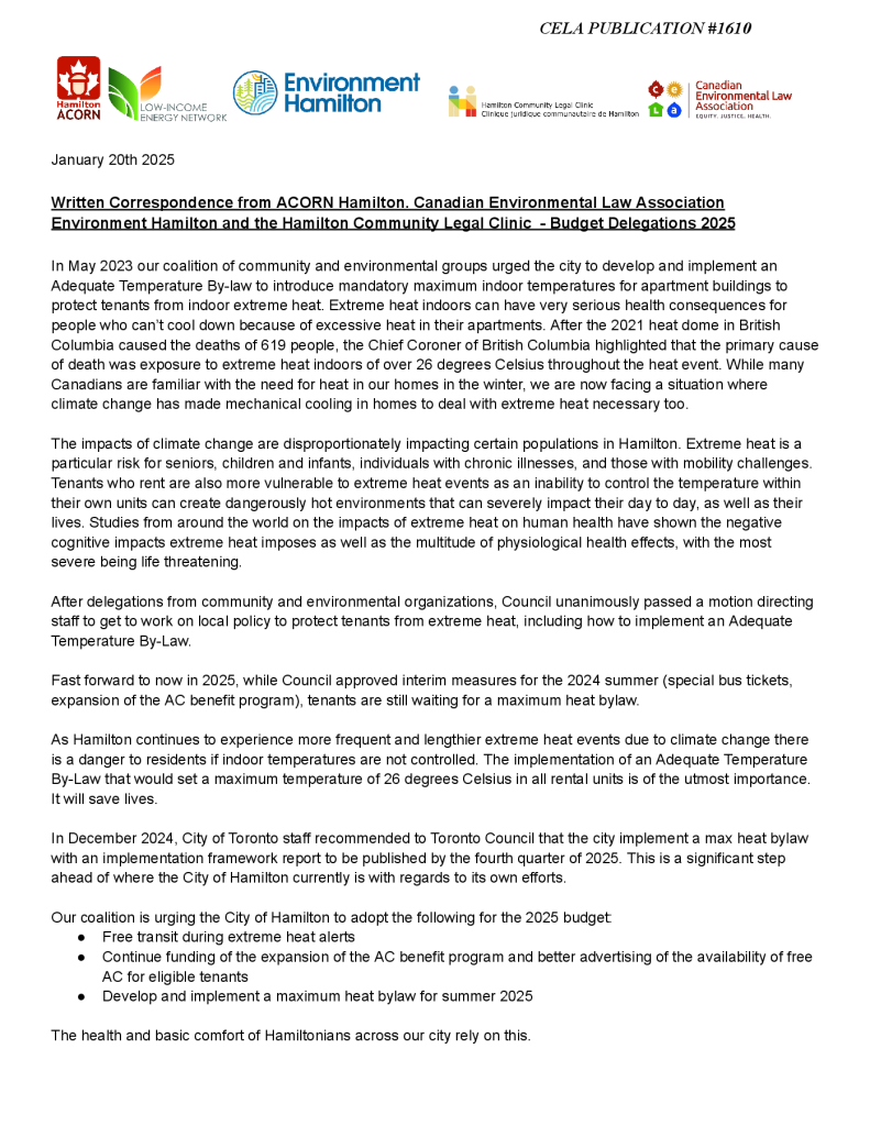 Joint Submission: CELA, ACORN Hamilton, LIEN, Environment Hamilton, and HCLC on Hamilton Budget Delegations
