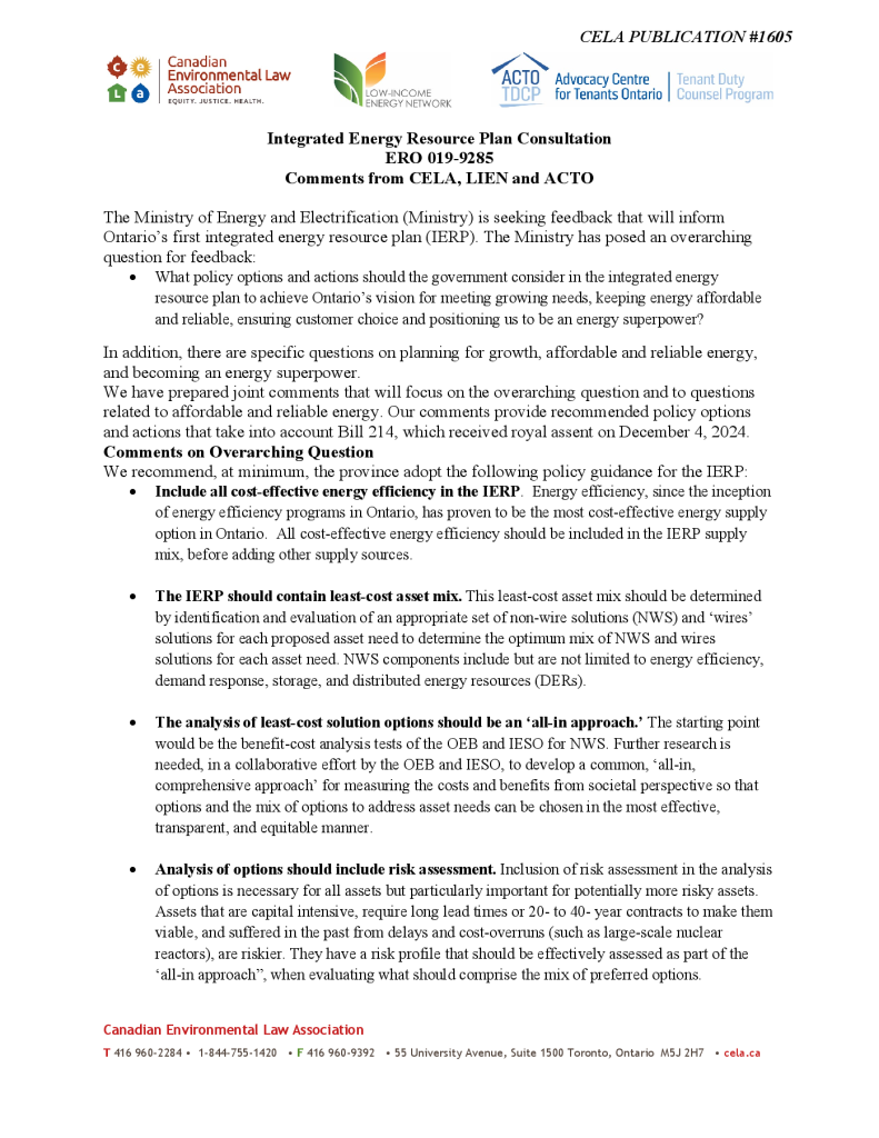 Joint Submission: CELA, ACTO, and LIEN Comments on ERO Posting #019-9285 – Integrated Energy Resource Plan Consultation