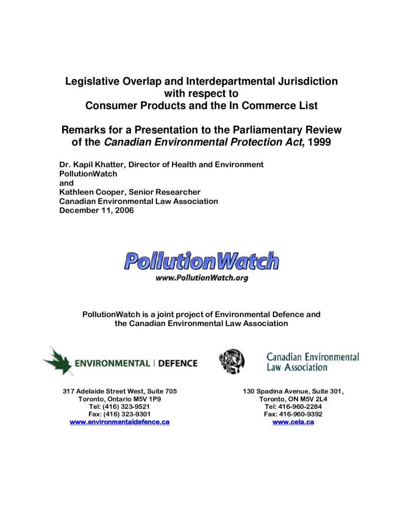 Legislative overlap and interdepartmental jurisdiction with respect to consumer products and the In Commerce list. Remarks for a presentation to the Parliamentary Review of the Canadian Environmental Protection Act, 1999