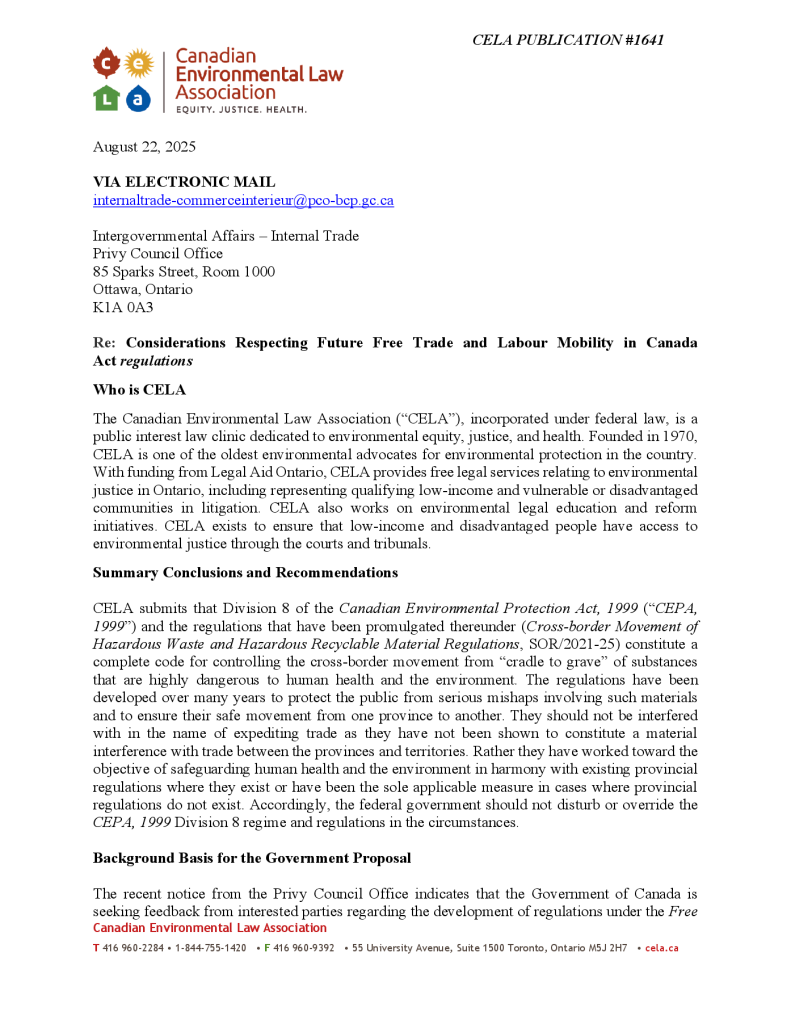 Letter: Hazardous Waste Regulations Under CEPA Should Not Be Trumped by Future Bill C-5 Regulations on Free Trade