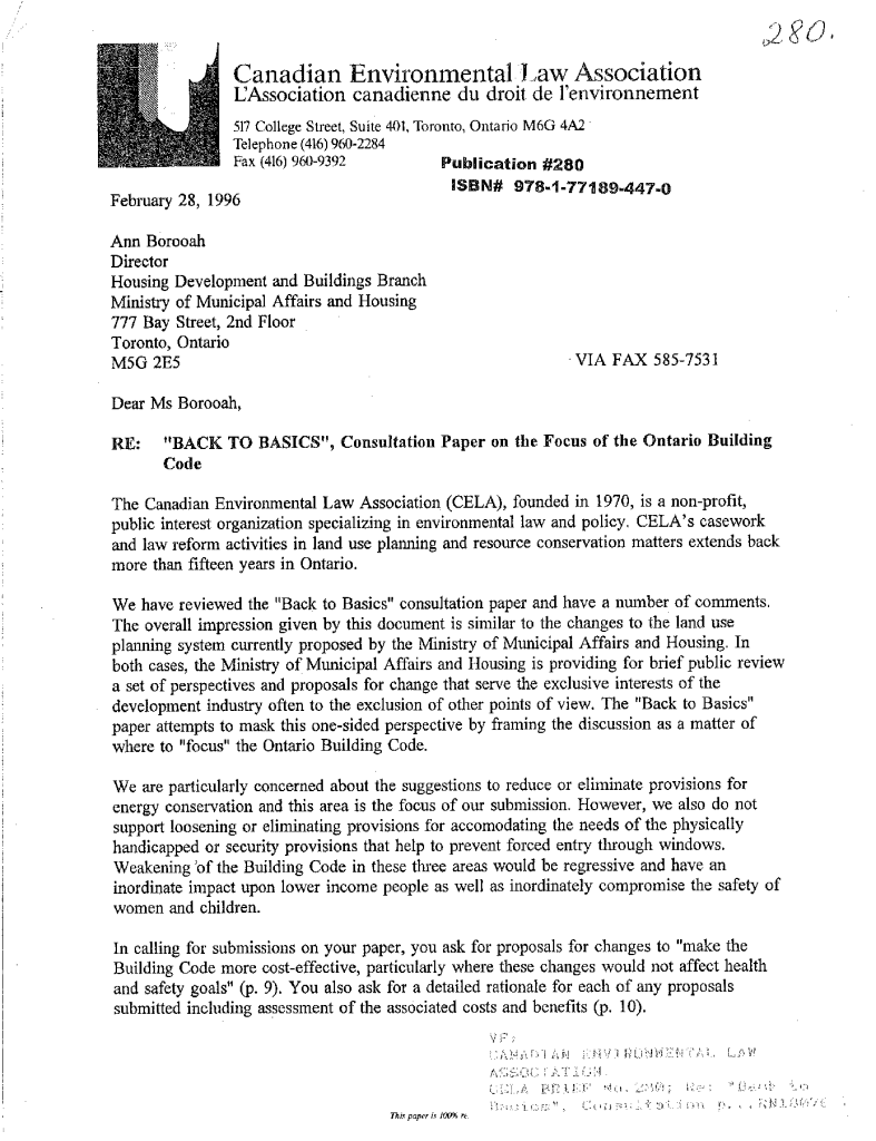 Letter re: “Back to Basics” consultation paper on the focus of the Ontario Building Code