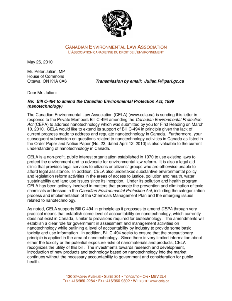 Letter re: Bill C-494 to amend the Canadian Environmental Protection Act, 1999 (nanotechnology)