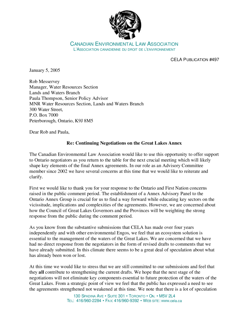 Letter re: Continuing negotiations on the Great Lakes Annex
