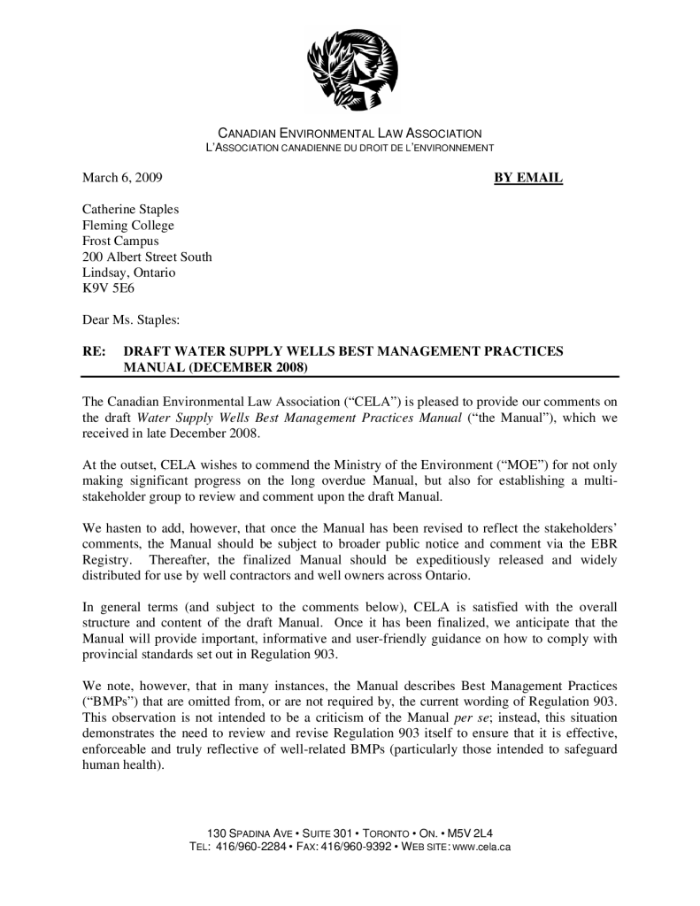 Letter re: draft water supply wells best management practices manual (December 2008)
