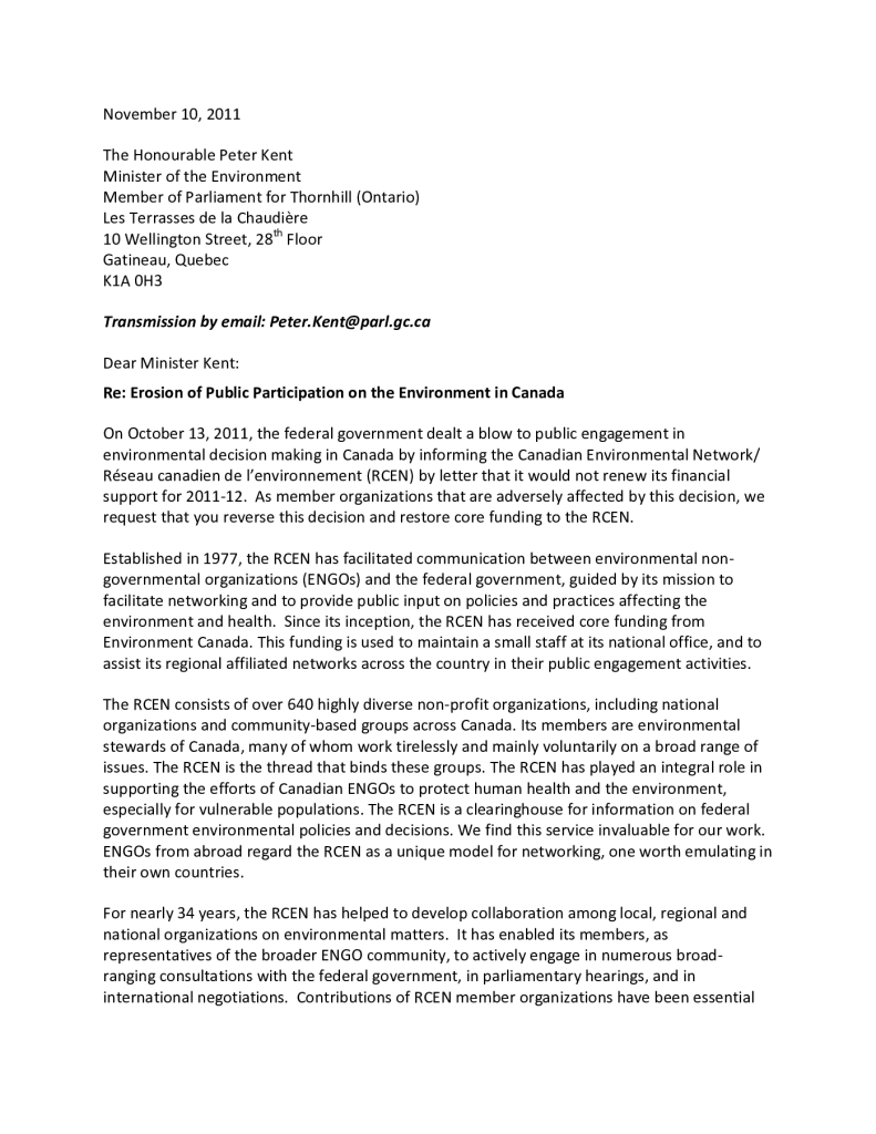 Letter re: erosion of public participation on the environment in Canada