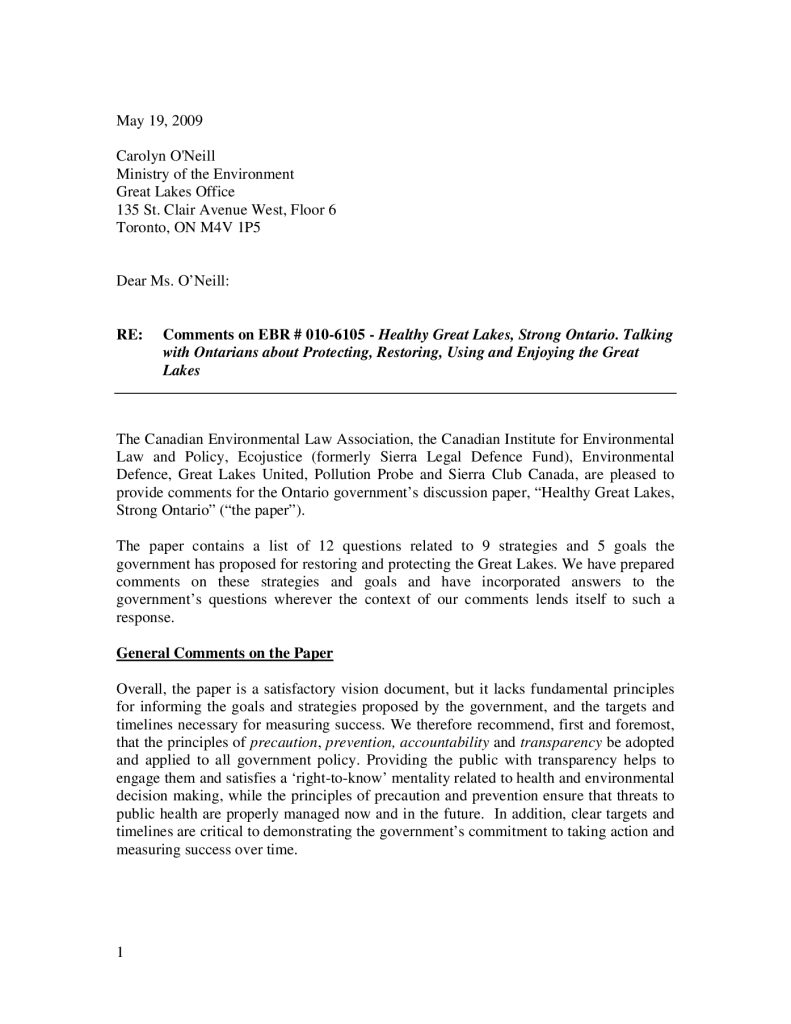 Letter re: healthy Great Lakes, strong Ontario. Talking with Ontarians about protecting, restoring, using, and enjoying the Great Lakes