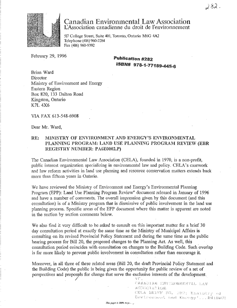 Letter re Ministry of Environment and Energy’s environmental planning program: Land use planning program review (EBR Registry Number: PA6E0002.P)