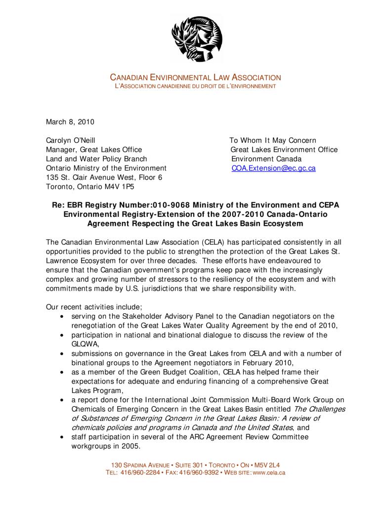 Letter re: Ministry of the Environment and CEPA Environmental registry-extension of the 2007-2010 Canada-Ontario Agreement Respecting the Great Lakes Ecosystem
