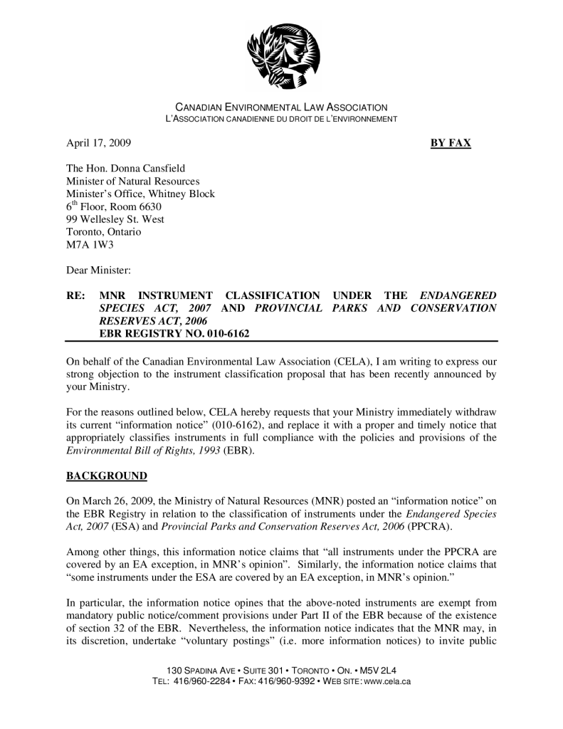 Letter re: MNR instrument classification under the Endangered Species Act, 2007 and Provincial Parks and Conservation Reserves Act, 2006