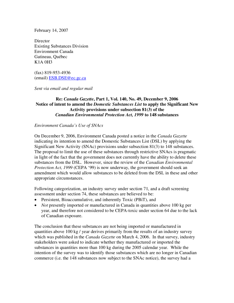 Letter re: Notice of intent to amend the Domestic Substances List to apply the Significant New Activity provisions under subsection 81(3) of the Canadian Environmental Protection Act, 1999 to 148 substances. Response to Canada Gazette, Part 1, Vol. 140, No. 49, December 9, 2006