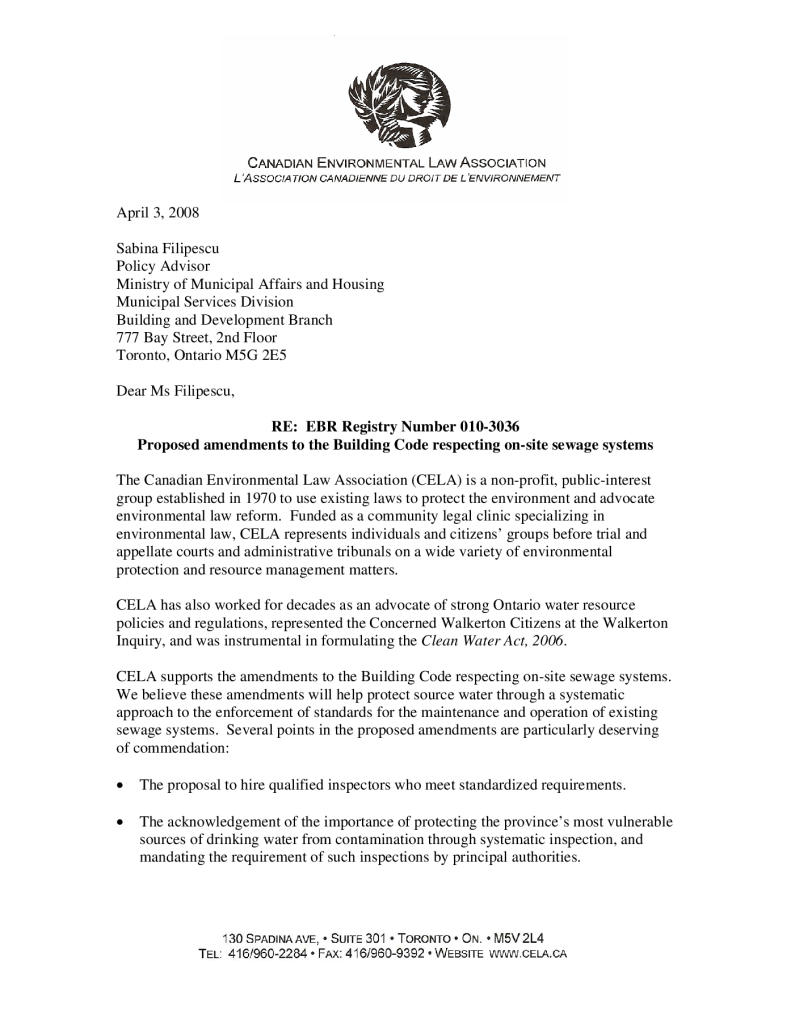 Letter re: proposed amendments to the Building Code respecting on-site sewage systems