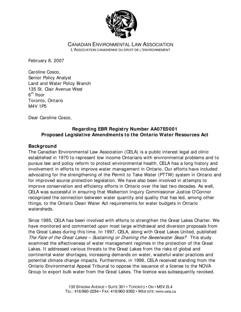 Letter re: proposed legislative amendments to the Ontario Water Resources Act